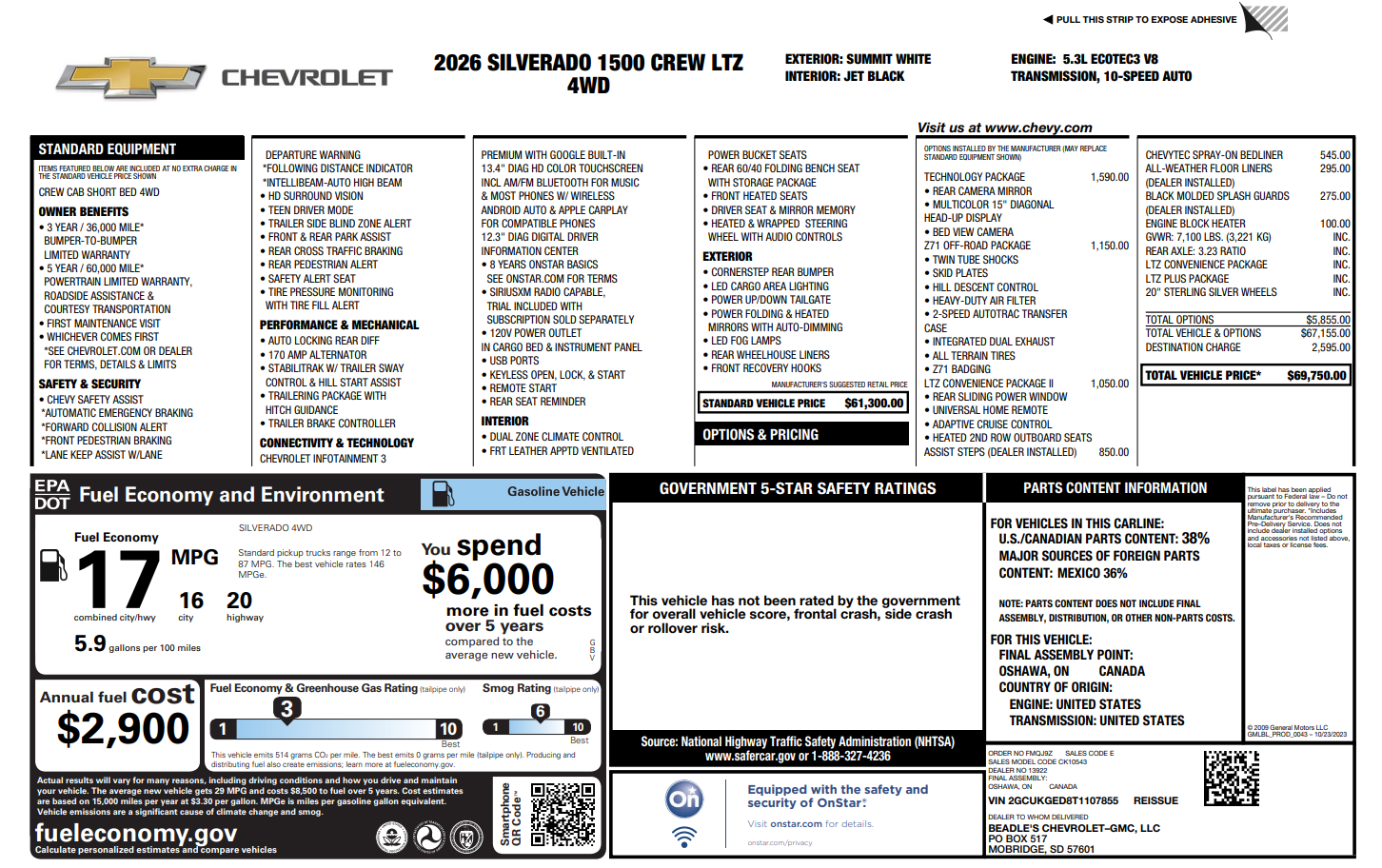 Premium comfort meets everyday truck capability in this 2026 Chevy Silverado 1500 LTZ 4WD Crew Cab, finished in Summit White over a Jet Black leather interior. Its 5.3L EcoTec3 V8 and 10-speed automatic deliver confident power, while LTZ adds upscale features, trailering tech, and a quiet, refined ride. EPA-estimated 17 MPG combined (16 city / 20 hwy). Stock #5W124 at Beadle Chevrolet in Mobridge, SD.
